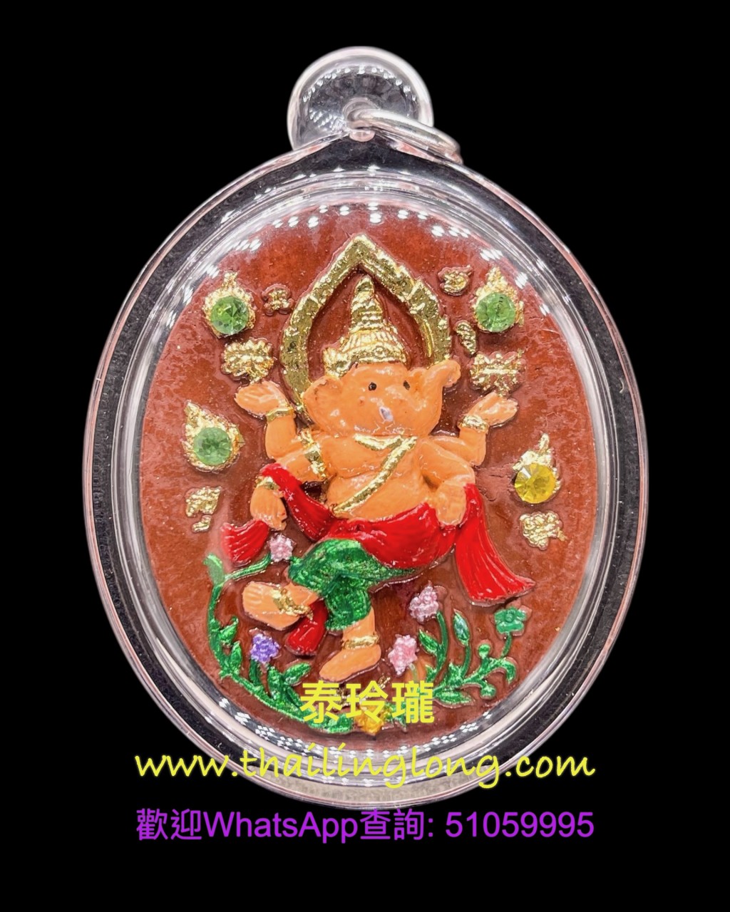 此尊 跳舞象神 寶石冷印 (經粉上色版), 於佛曆2558年(2015年)由 泰國頂級白衣(阿贊礦)親自督製開光, 材質整尊均以經粉/植物粉製作而成~ 而牌前為''四手象神''手持法器的跳舞法相(此種法相的象神,更象徵了行動力較強), 並入有四粒寶石, 以喻意加強人緣之作用, 牌背均印有招財經文及符印, 並在供請時師傅再次親自加持及攢上符印, 亦加強了此''跳舞象神''的招財功效, 適合祈求財富及任何行業的善信們佩戴~