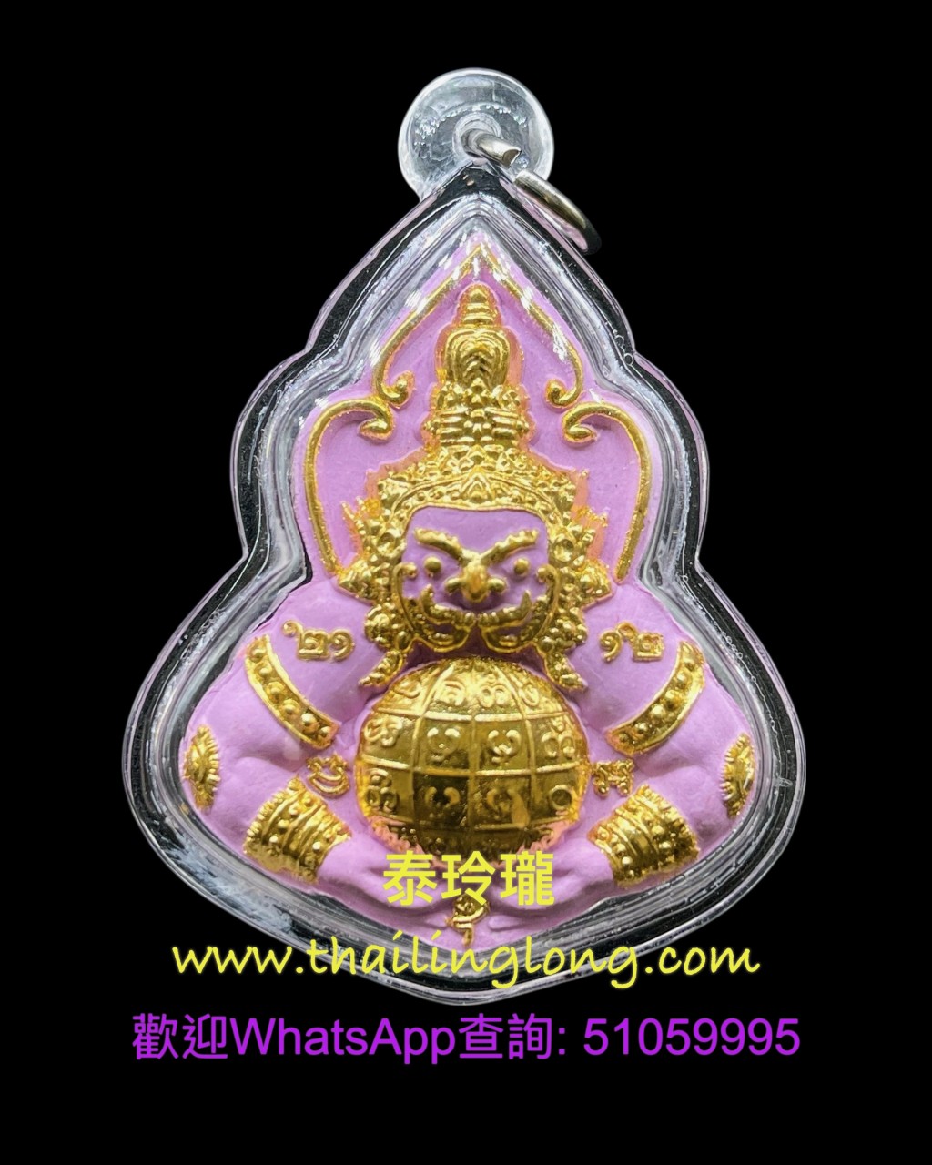 此尊 拉胡天神 冷印 (上色經粉金漆版)粉紅大模, 於佛曆2558年(2015年)由 (阿贊礦) 親自督製開光~ 材質整尊均以人緣經粉製作而成, 並塗上金漆~ 牌前為傳統''拉胡天神''咬月亮的法相, 牌背均印有避險/擋是非小人的符印~ 以及在供請時師傅於佛牌殼背面親自撰上符印並再次進行開光加持, 能提升此尊''拉胡天神''的助力~ 非常適合人事關系複雜的工作環境或犯太歲之善信們佩戴~